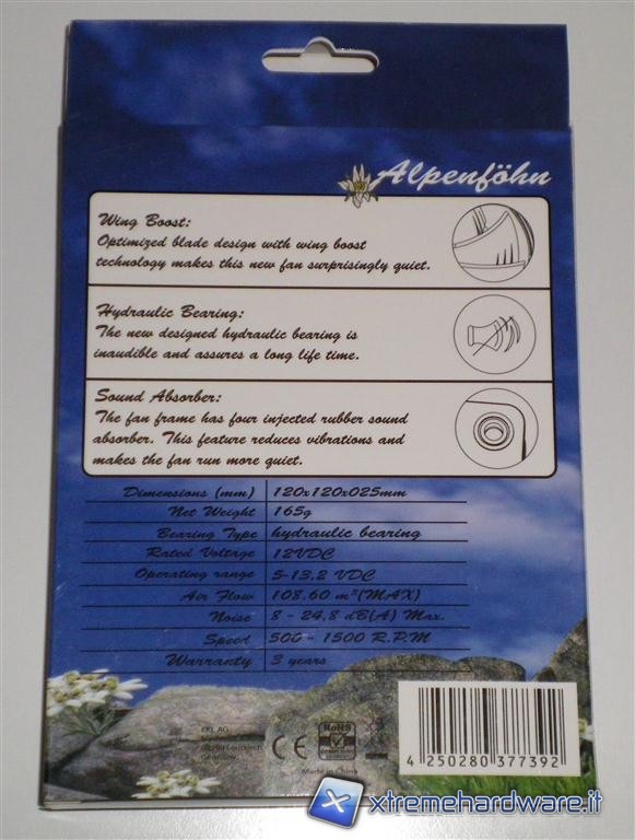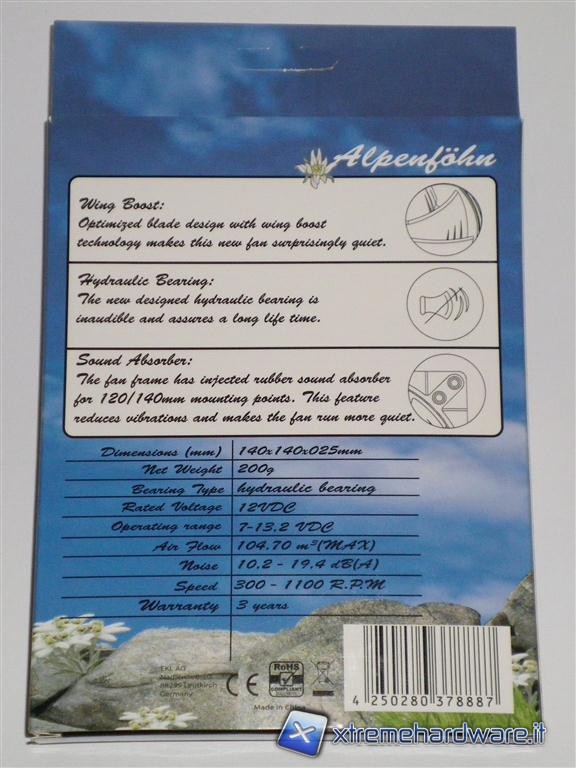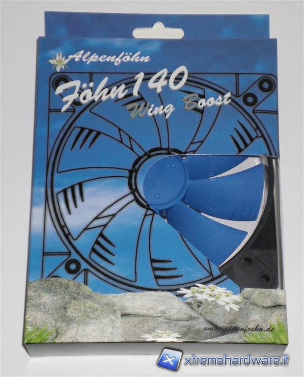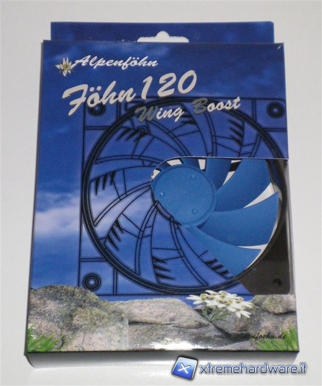 La scatola si presenta con una predominanza azzurra, o meglio sono rappresentati i colori del cielo, nella parte bassa sono invece raffigurare delle rocce assieme a dei fiori di loto. Nella parte frontale oltre al marchio Alpenföhn, vi è la tipologia di ventole Föhn Wing Boost e la dimensione da 120mm o da 140mm, vi è in trasparenza la possibilità di osservare direttamente la ventola nelle sue parti. Sul retro della scatola vi sono indicate la caratteristiche principali e  le tecnologie adottate per la costruzione.