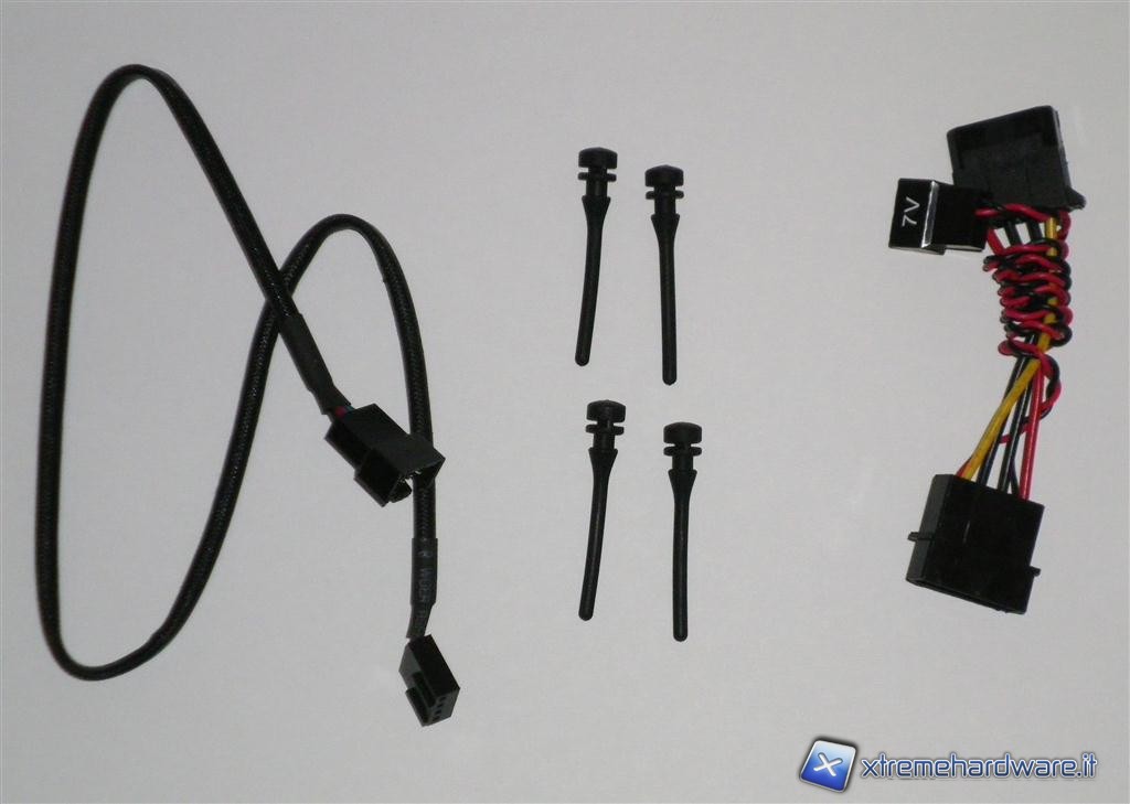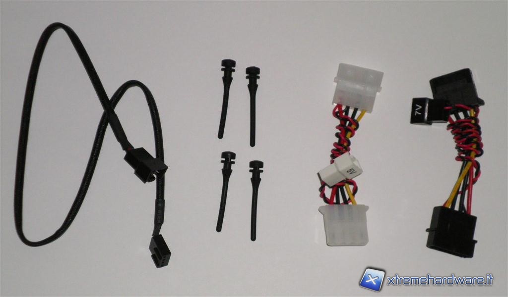 Il bundle è molto completo, abbiamo infatti 4 gommini molto morbidi per fissare la ventola e prolunga a 3pin di circa 44 cm per ambedue le ventole. Nel modello da 120mm sono presenti due adattatori per collegare la ventola ad un molex 4pin dell’alimentatore, uno per ridurre il voltaggio dai 12V ai 7V e l’altro invece lo riduce fino a 5V. Invece nel modello da 140mm abbiamo soltanto un adattatore che riduce il voltaggio da 12V a 7V, questo perché la ventola ha un regime di rotazione di poco inferiore rispetto al modello da 120mm, e rimane pertanto inudibile anche da 7V.