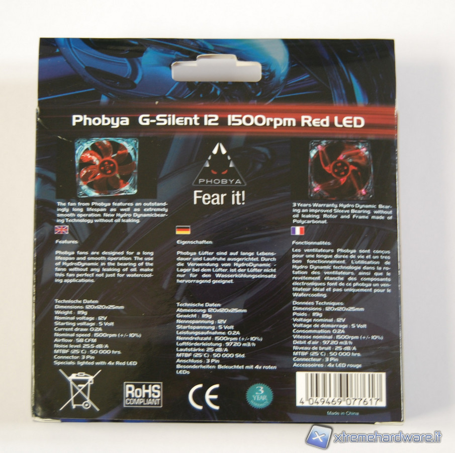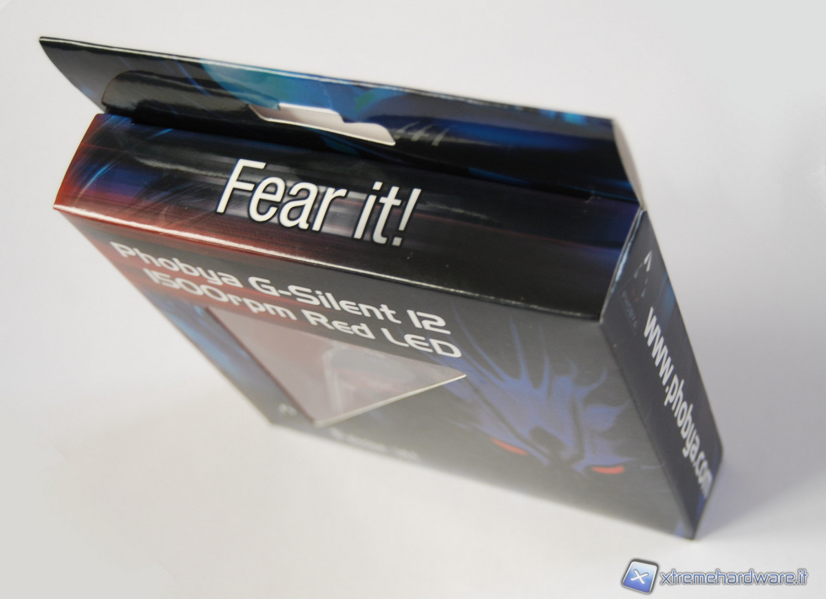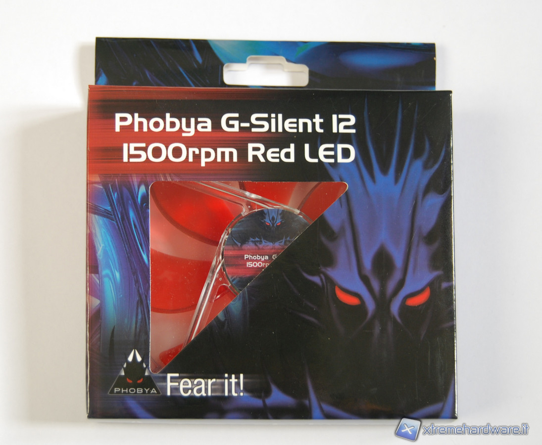 La ventola G-Silent 12 viene venduta in un’accattivante confezione di cartone. Il simbolo di Phobya è un avatar dall’aspetto minaccioso. La scatola riporta il motto “Fear it!”. Lo scopo di questa scelta di design non è certo quella di spaventare i potenziali acquirenti, ma piuttosto di comunicare la sensazione di essere di fronte a un prodotto potente, in grado di domare i bollenti spiriti del nostro pc.