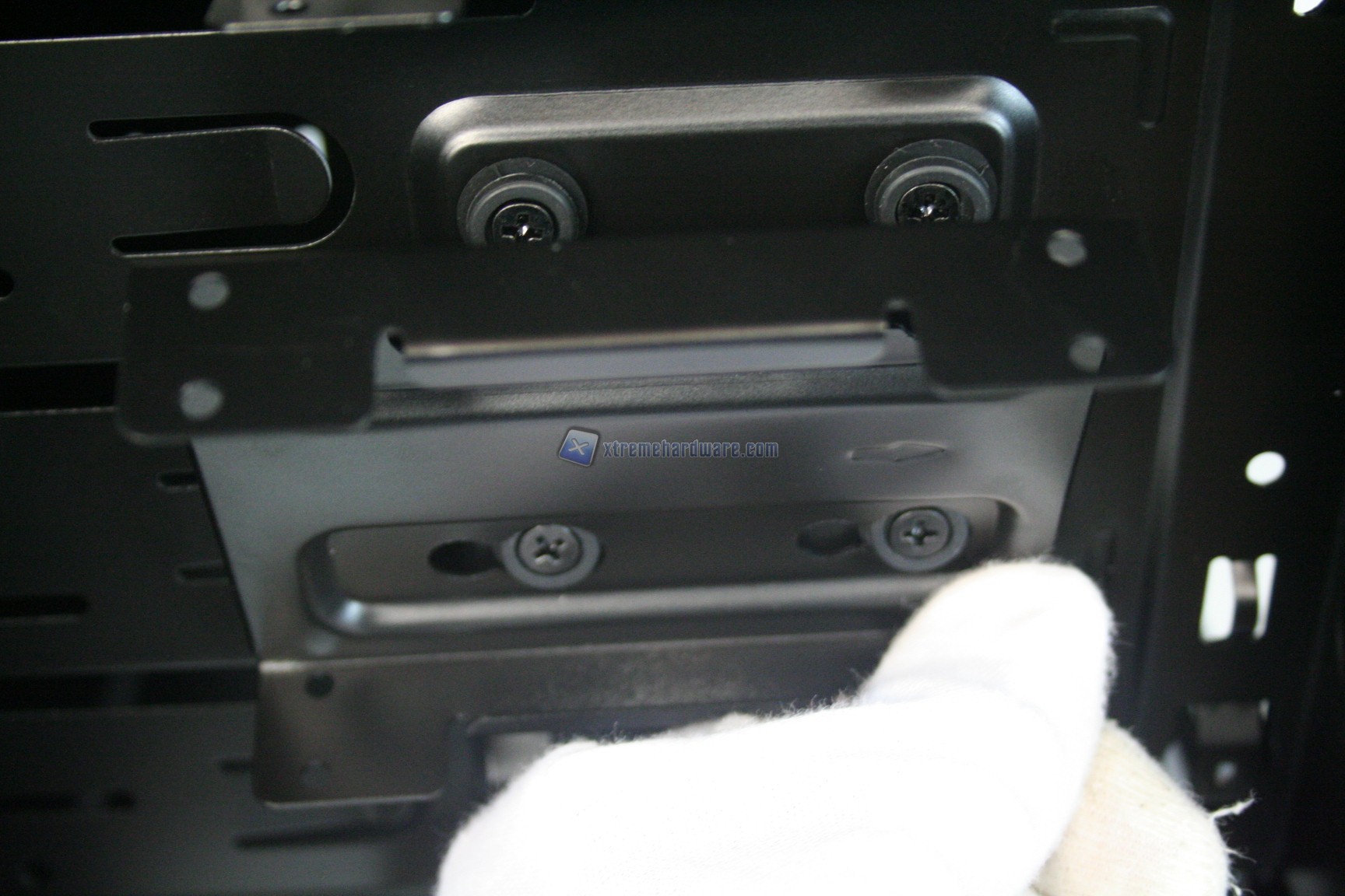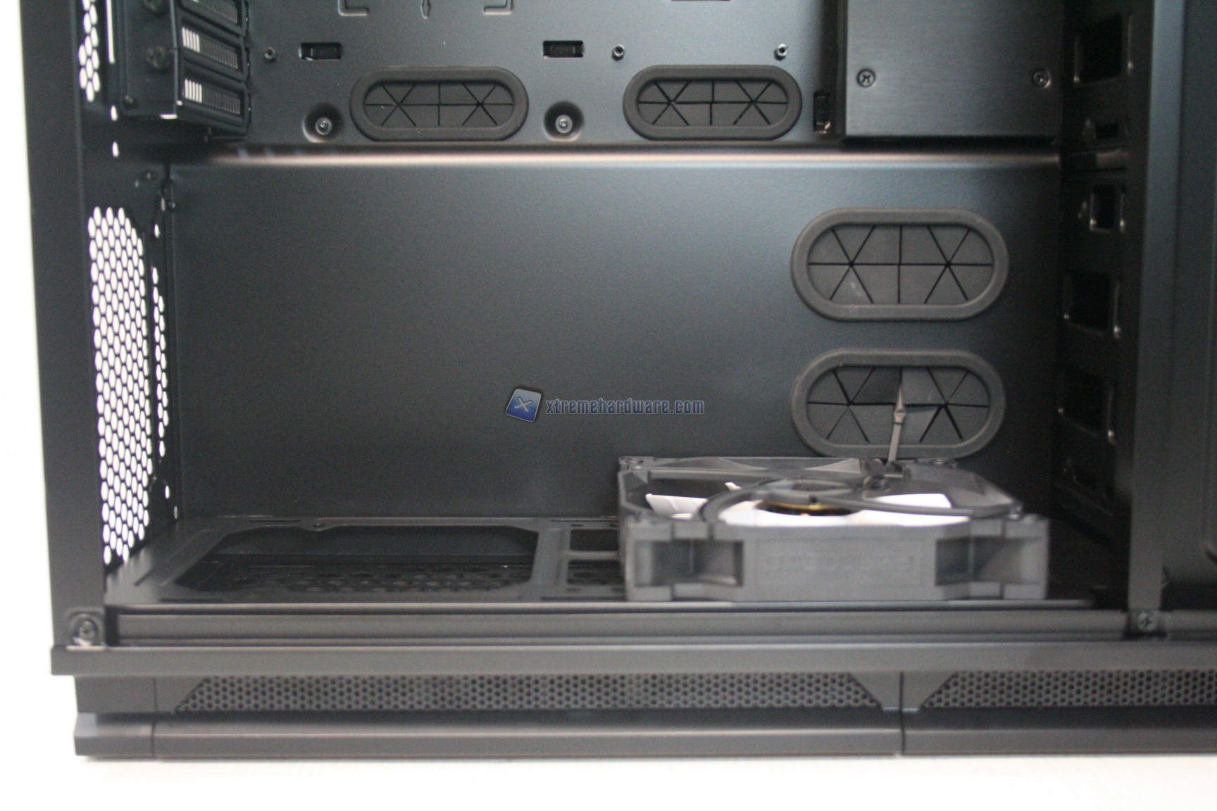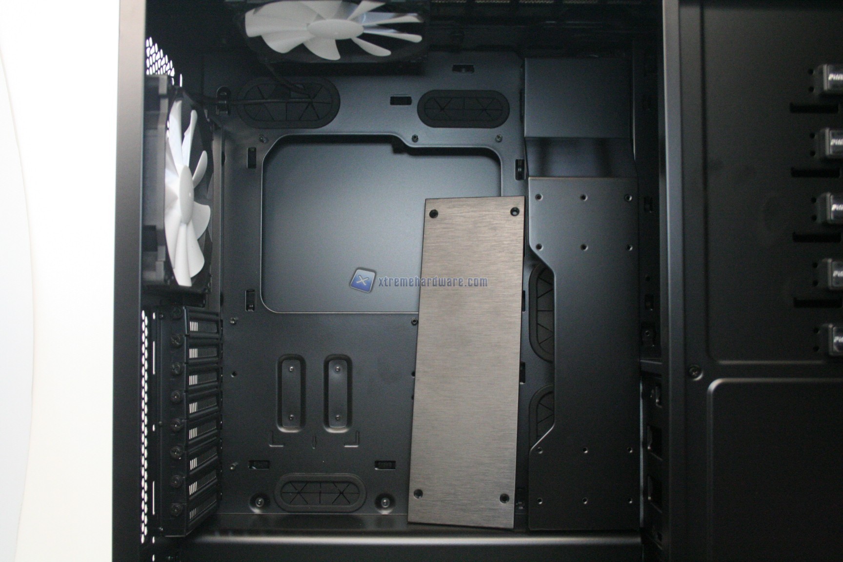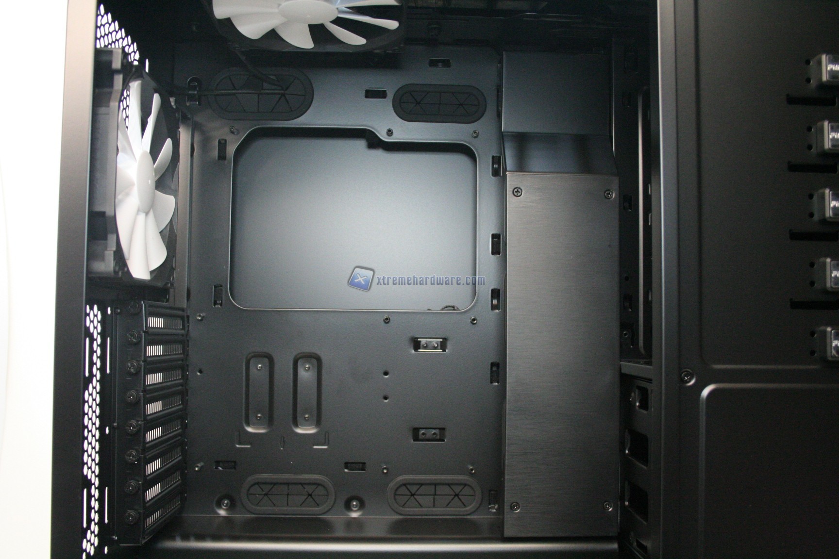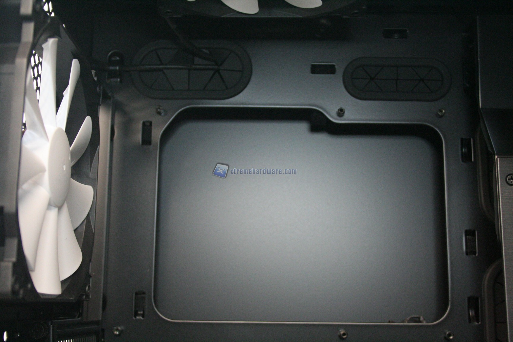 Il piatto della scheda madre è interamente in acciaio, e diversamente da alcuni modelli di cabinet top di gamma degli anni passati, non è removibile. Sono presenti sette grandi aperture dotate di gomma antitaglio, di ottima fattura e molto resistenti alla rimozione accidentale, più altre due in basso. Le tre laterali però sono coperte da una placca che serve per l’installazione di vaschette verticali, però può essere rimossa.