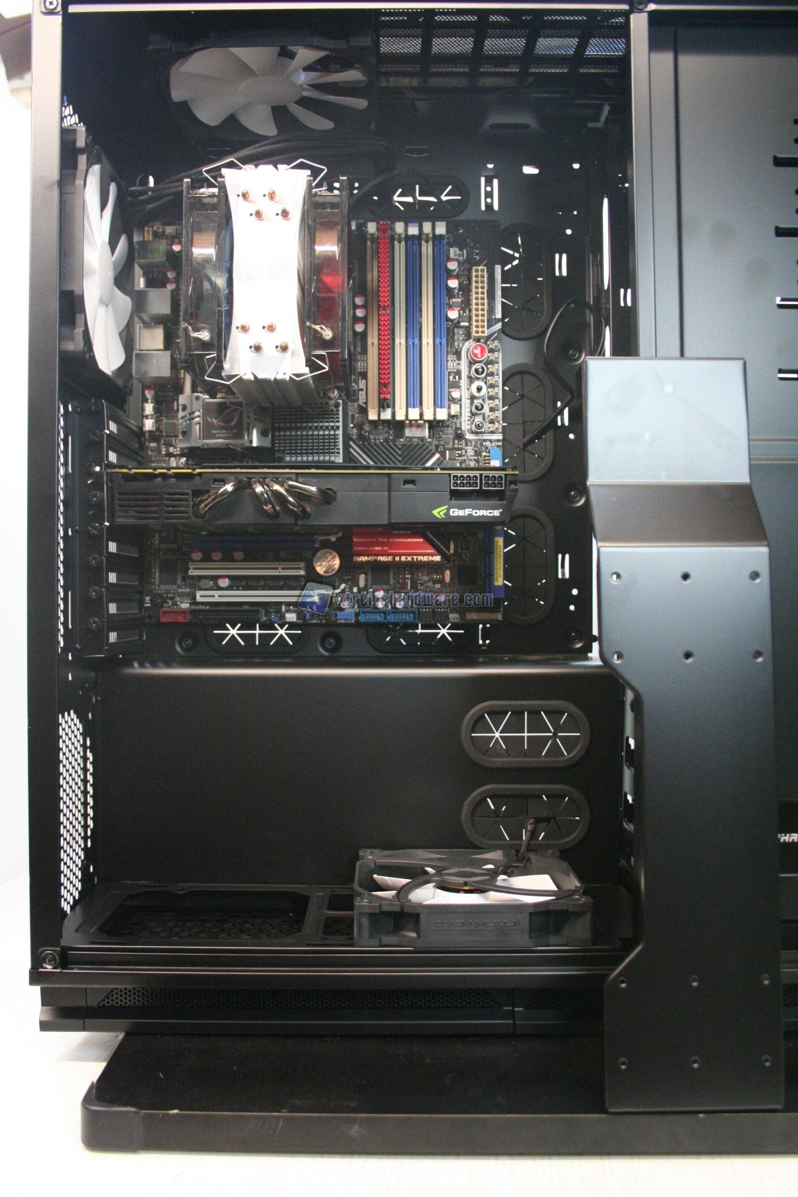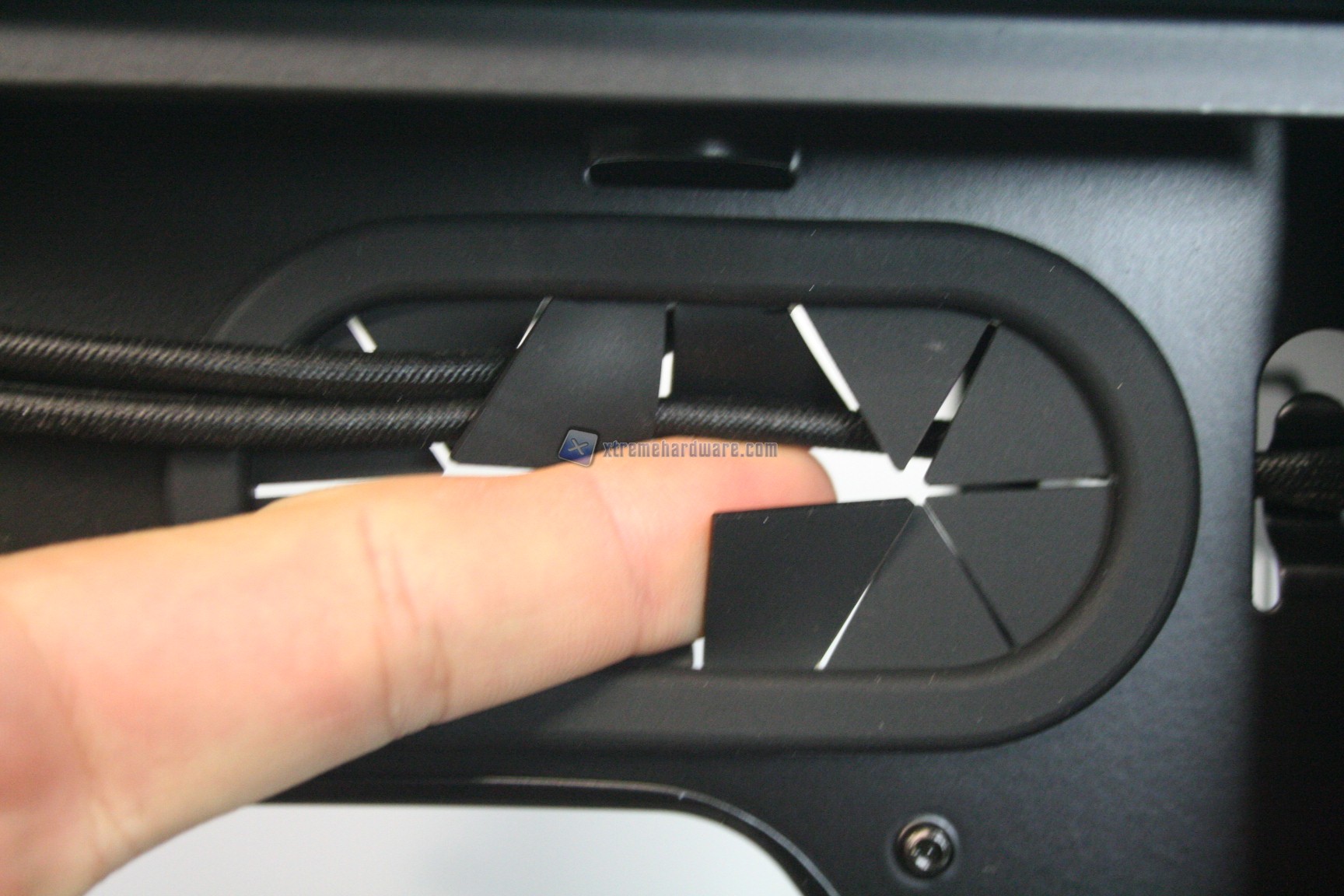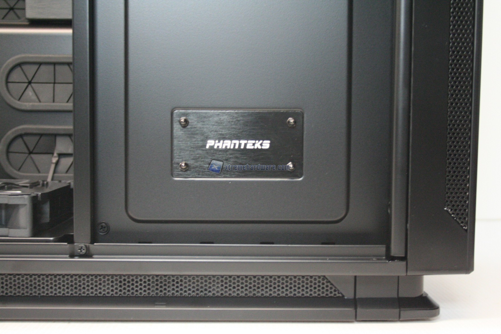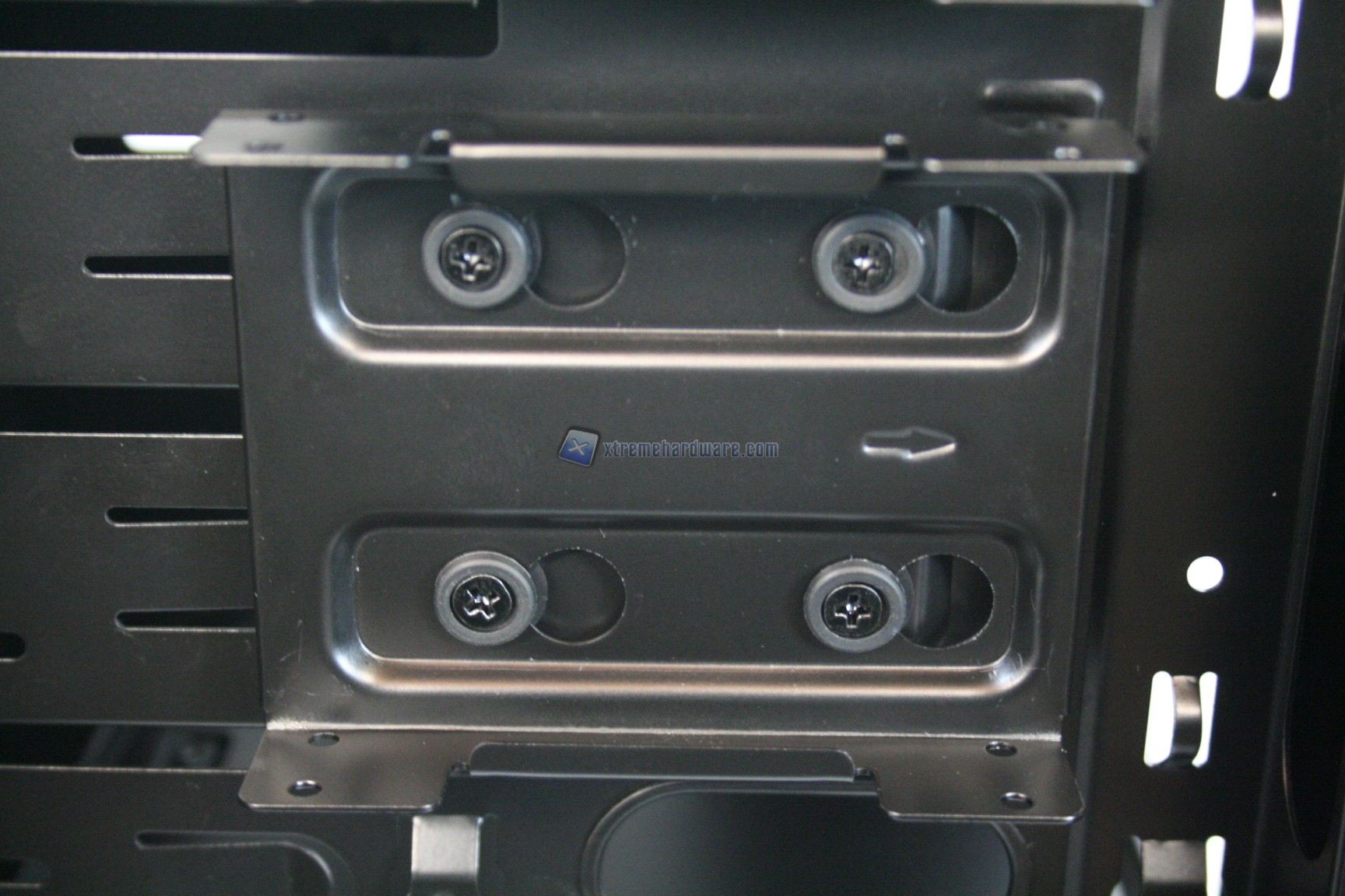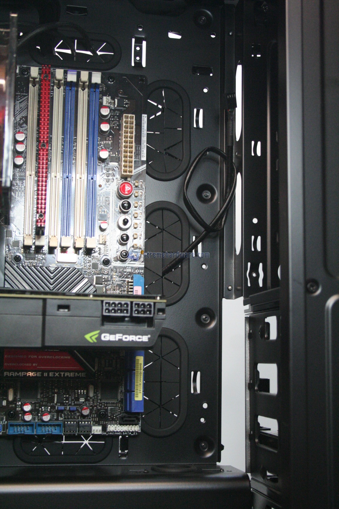 Il piatto della scheda madre è interamente in acciaio, e diversamente da alcuni modelli di cabinet top di gamma degli anni passati, non è removibile. Sono presenti sette grandi aperture dotate di gomma antitaglio, di ottima fattura e molto resistenti alla rimozione accidentale, più altre due in basso. Le tre laterali però sono coperte da una placca che serve per l’installazione di vaschette verticali, però può essere rimossa.