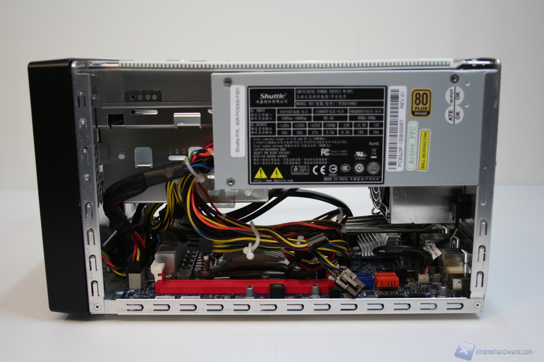 La parte frontale è molto elementare, pulita ed ordinata, con paratie a scomparsa. Presenta due porte USB 3.0 frontali (2x posteriori), due porte USB 2.0 (4x posteriori), un’entrata per il microfono ed una per le cuffie, con jack da 3.5’’. Nella parte superiore della paratia frontale è inoltre presente l’ingresso del lettore ottico, mascherato dietro uno sportellino a scomparsa assieme a quella per un’unità da 2.5’’. La pressione del pulsante ‘’eject’’ permetterà quindi la fuoriuscita del carrello di inserimento del lettore DVD, che poi verrà nascosto nuovamente a causa di un meccanismo a molle orizzontali. Precisiamo che sarebbe possibile installare un singolo bay hot swap, ma deve essere acquistato separatamente, per sfruttare il cage hard disk da 3.5 pollici. Nella parte centrale è presente una piccola finitura opaca con impresso il logo shuttle, nella parte sinistra, mentre nella parte destra sono presenti i LED Hard Disk e di accensione, il quale funziona anche da pulsante ON/OFF dell’unità.