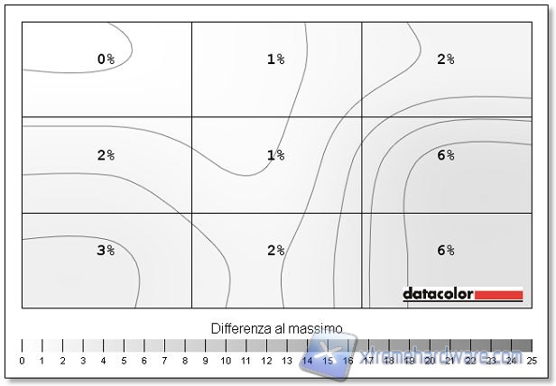 Suddividendo lo schermo in nove rettangoli, abbiamo misurato con il colorimetro l’uniformità della luminosità e dei colori. La differenza massima registrata è risultata pari al 7%, con una media del 3,8%, per quanto riguarda la luminosità, mentre per il colore, il Delta-E maggiore è stato di 2,1, con una media dell’1,2. La media scende rispettivamente al 2,6% e a 0,8 attivando la modalità SmartUniformity.