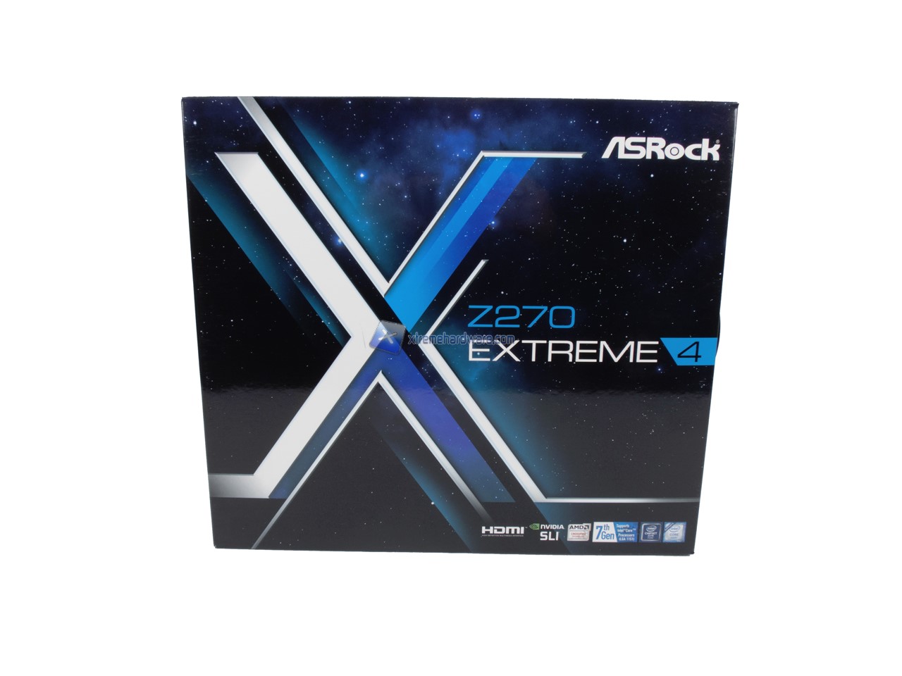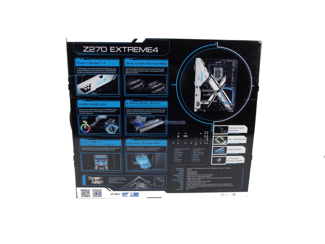 La ASRock Z270 Extreme4 ci verrà consegnata in una classica confezione di cartone a doppio involucro. La grafica esterna è stata ammodernata e rimanda subito, con la lettera X, all’omonima serie Extreme. Sulla confezione in ambo i lati principali troveremo diverse informazioni e alcune immagini.