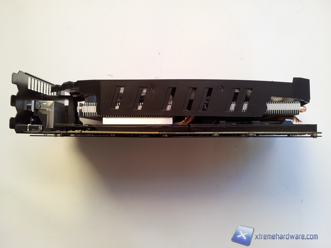 L'imponente sistema di dissipazione della ASUS HD 7970 Matrix Platinum è composto da due superfici lamellari entrambi connesse al corpo dissipante principale della GPU attraverso grosse Heatpipes; solo una delle due superfici lamellari è connessa direttamente anche al corpo dissipante principale.