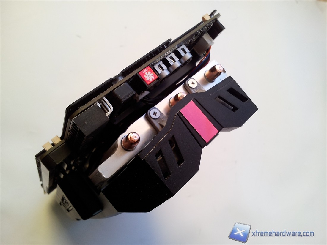 Le 5 Heatpipes non potevano ovviamente essere tutte a contatto con la GPU quindi in questo caso è stata adottata una base in rame di contatto. Particolare è la conformazione appiattita delle heatpipes in questa zona, per favorire lo scambio termico con la base stessa.